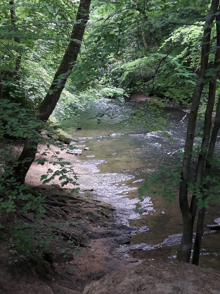 Away from the mill, now preserved for its industrial history, footfall reduces. Few visitors venture along the Bollin Valley Trail. Here the wooded banks crumble into small beaches, the deposits of a meandering river. Deciduous trees lean over the water; I recognise oak, beech, hornbeam, sweet chestnut. A few have lost their purchase on the thin topsoil. Tumbled down the banks, they disintegrate, forming new habitats for fungi and beetles.