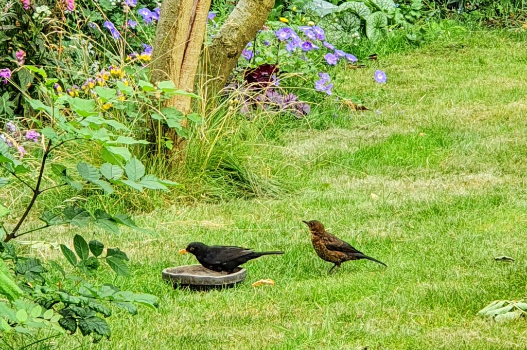 I notice another bird watching from the sidelines, “Is it a thrush? Why is it shouting at the starlings?” As the starlings fly off to argue elsewhere, Mr Blackbird arrives and I realise my thrush wannabe is the blackbird fledgling, attempting to get anyone to feed it. The teenager hops down to the ground, finally picking the right species to shout at. Mr Blackbird – Dad – passes over some grubs and darts back into the undergrowth to fulfill his offspring’s requests.