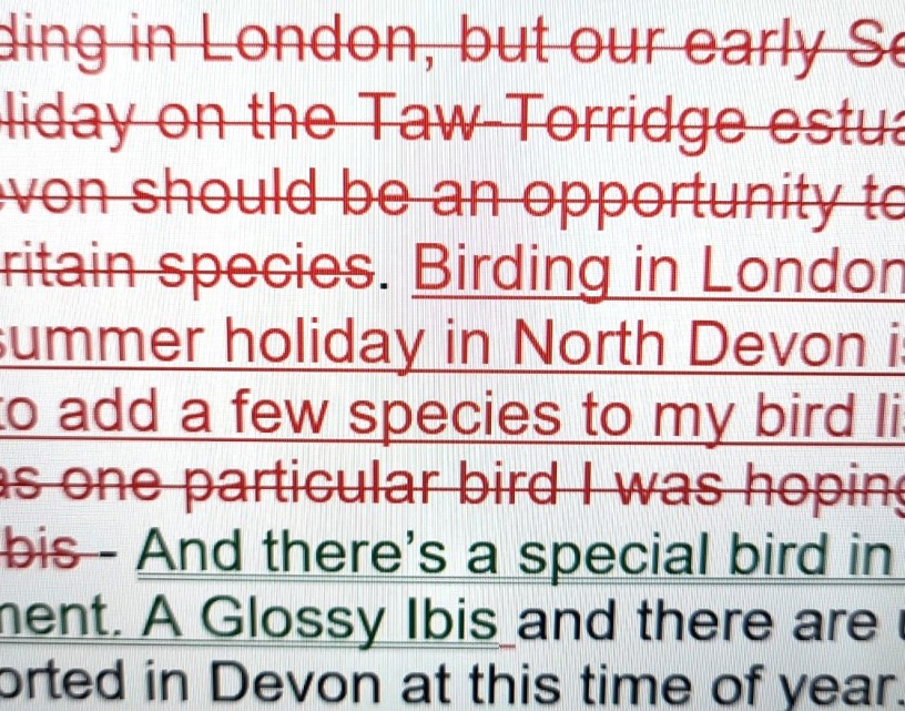 The difference between ‘nice‘ and ‘great’ creative nature writing often comes down to the quality and thoroughness of editing carried out after the first draft has been written. The usual rule of thumb I suggest to participants in my writing workshops is to expect to spend at least twice as much time editing and polishing as you do draft. As I meet each group of new writers, I can usually see that some are sceptical. There may be a perception that really good writers should just be able to write streams of beautiful prose straight off, and that writing process should be easy. If my sceptics suspend disbelief and really commit to developing an editing process which works for them, they frequently begin to produce really well-written, compelling nature writing. Other sceptics are harder to persuade; their writing may be ‘nice’ but they never manage to push it up to the next level. The bottom line is that creative writing is both fun and hard work. In this article, I hope to persuade you of the value of focussed editing to achieve that step-change in your writing, and I’ll suggest an approach you could take.