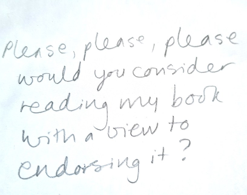 I entirely understood the perspective that it’s unpaid, and you have to read a reasonable amount of a book and then write something about it, but for me as a first-book author, it was mortifying. The thought of writers rolling their eyes when they received my entreaties was cringe-worthy. But it had to be done.